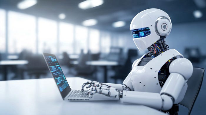 Original thought → robot assist → AI detector panic → “Make It Sound Human” button → back to fake-authentic.